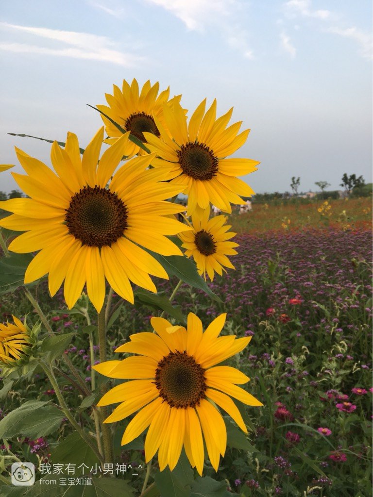 一大片一大片的花海让人心情愉悦,各种颜色也令人欢喜。看那各种颜色的格桑花随风摇曳,展示它们的魅力,小小的一朵很是可爱,其实我也买过种子在家里种过,但是几颗花队脚朵跟一片花海是无法相提并论的,自是比不上。还有那耀眼的向日葵,长势喜人,那明报训恨亮的黄令人无比的温暖。还有不知名的紫色小花,一簇簇的,让人怜爱。还有一座大风车的建筑,夕阳为背景,引得游客纷纷拍照。