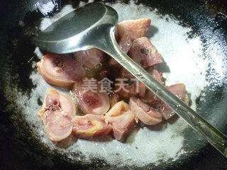 5 烧锅倒油烧热,下入剁好的腊鸡腿孟扬卫翻炒翻炒。