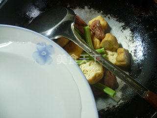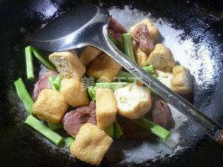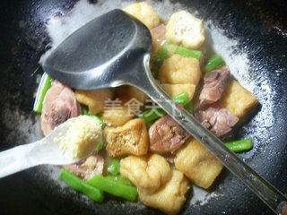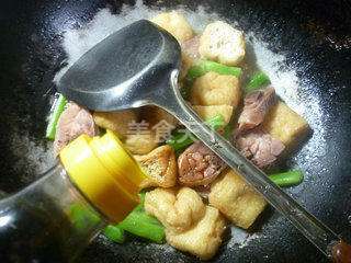 6 接着,合入摘洗好的梅豆和切好的油豆腐翻炒一下。