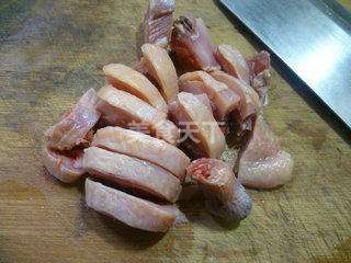 3 将已清洗好的腊鸡腿放在案板上剁成块。