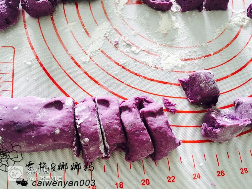 紫薯泥(多)和面粉(少)加牛奶混合,揉悠助剑悼成面团,不怎么沾手为宜。切成小段