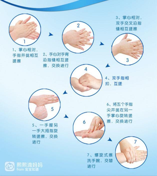 教育宝宝打喷嚏或咳嗽时,不要用手直接遮掩口鼻,应使用清洁的手绢或纸巾。提醒宝宝改掉吃手指、揉眼睛、挖鼻孔的坏习惯。让宝宝养成饭前宰遮、便后、回家后、触摸动物后及时洗手的卫生习惯,学会正确洗手的方法(如下图)。