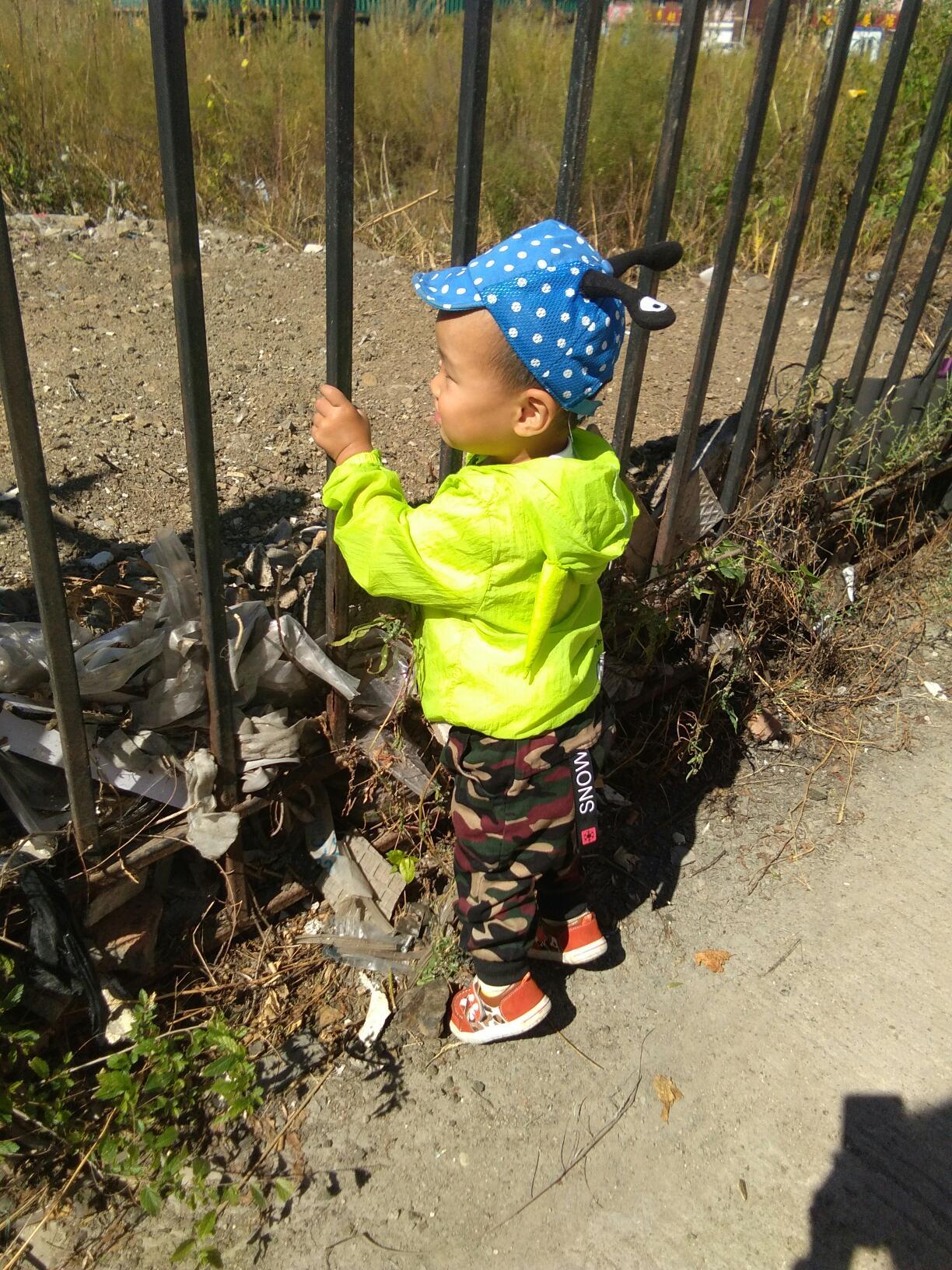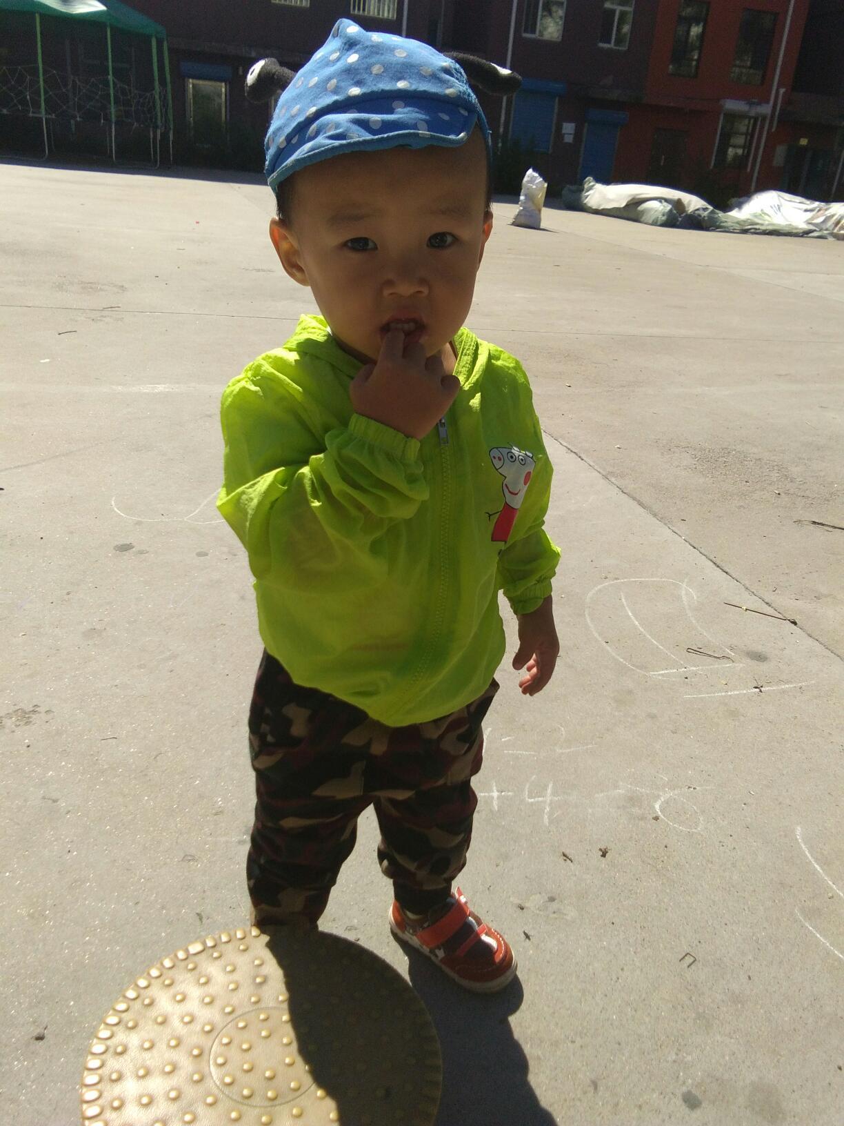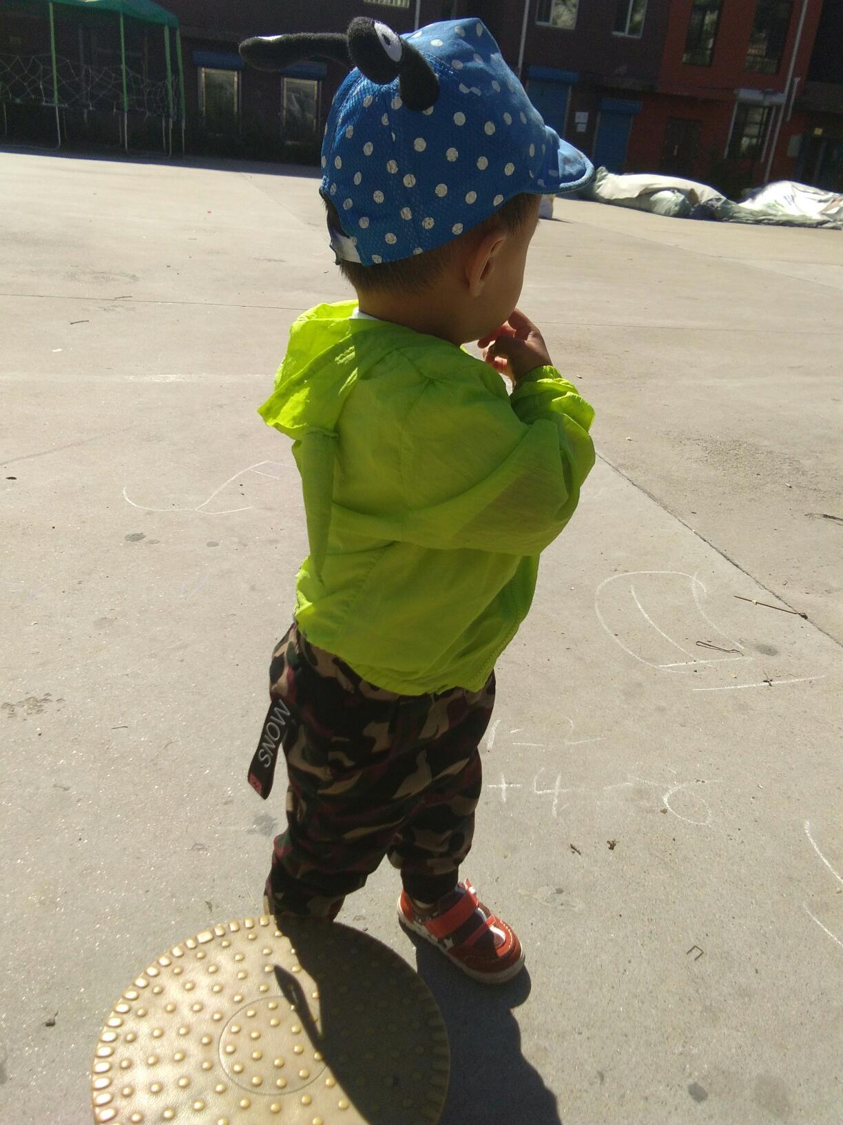 穿上迷彩裤子有一点小小男子汉的样子了,上身穿了一个白色的半袖,外面穿了一件小猪佩琪的小外套。本来没打算给他带帽子的,可是宝爸怕他宝贝儿子冷,把他的小帽子带上了。