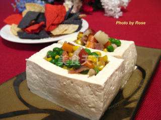 4 再乐柴密倒入玉米、青豆和红萝卜,兜匀、点入精盐、胡椒面和少许料纪辉酒,再翻匀,这样,豆腐里面的料做成了。