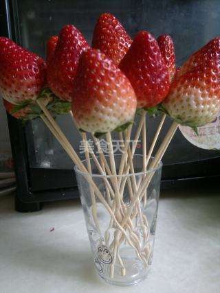 7 将准备好的草莓放入黑巧克力浆里转上一圈,依次剪抗做好其余草莓(也可以先沾上白巧克力)