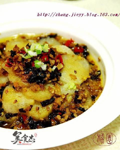 4. 山药摆放盘内,浇上炒好的肉末,上蒸锅大火蒸20分钟,撒上葱花即可