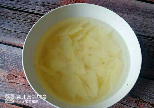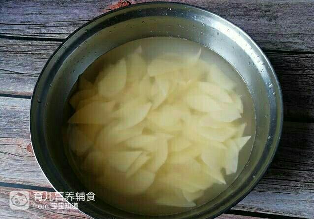 2.将土豆片放在清水中投洗去淀粉,这样土豆片不会氧化发黑