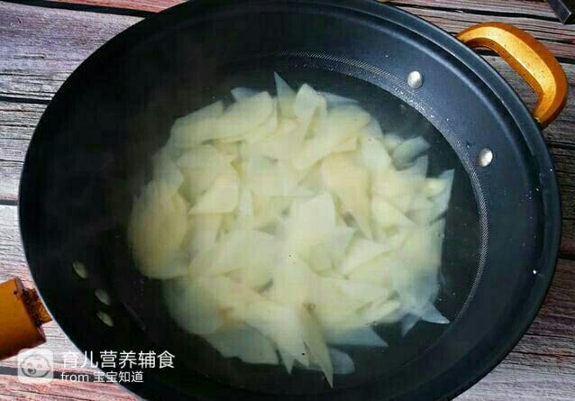 4.锅加水烧开,下入土豆片焯水至断生