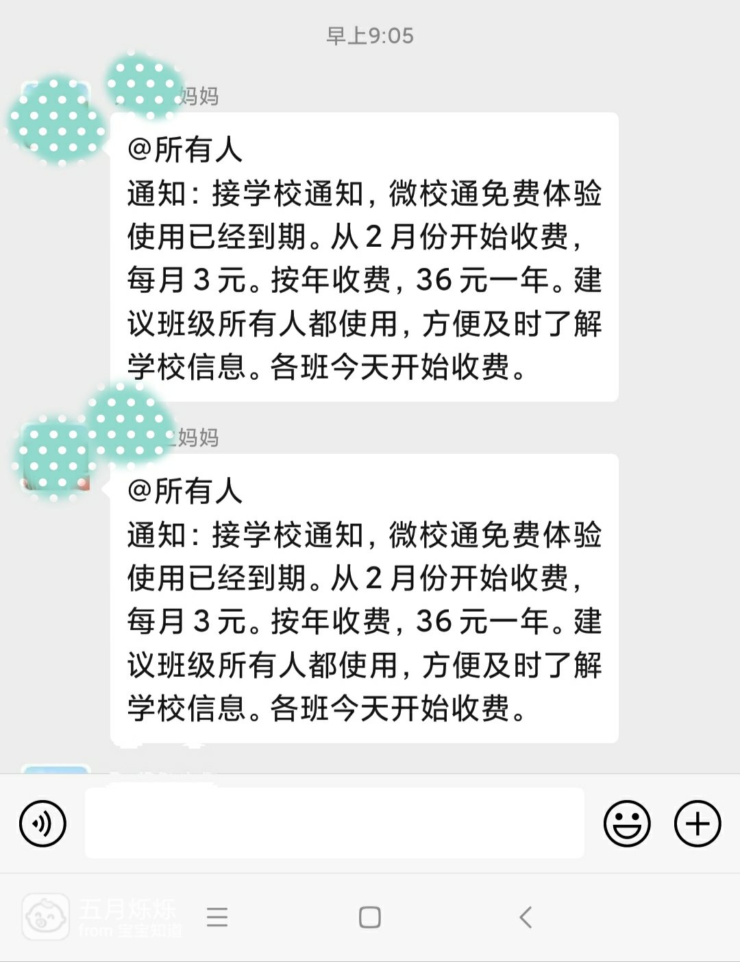 之前使用的微校通,一年要60块,后来可能是太多家长们有意见,觉得太贵了,就们敲改为免费体验半年。今天早上就收到家委员的信息,说今天要收微校通的费用了,这次费用比之前少了差不多一半,不管用处大不大,都是要交的,我把钱转给家委员,其他家长很快也都转钱了。
