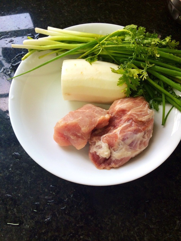 准备精瘦肉,喜欢肥肉的以可以加一点,萝卜,葱,香菜