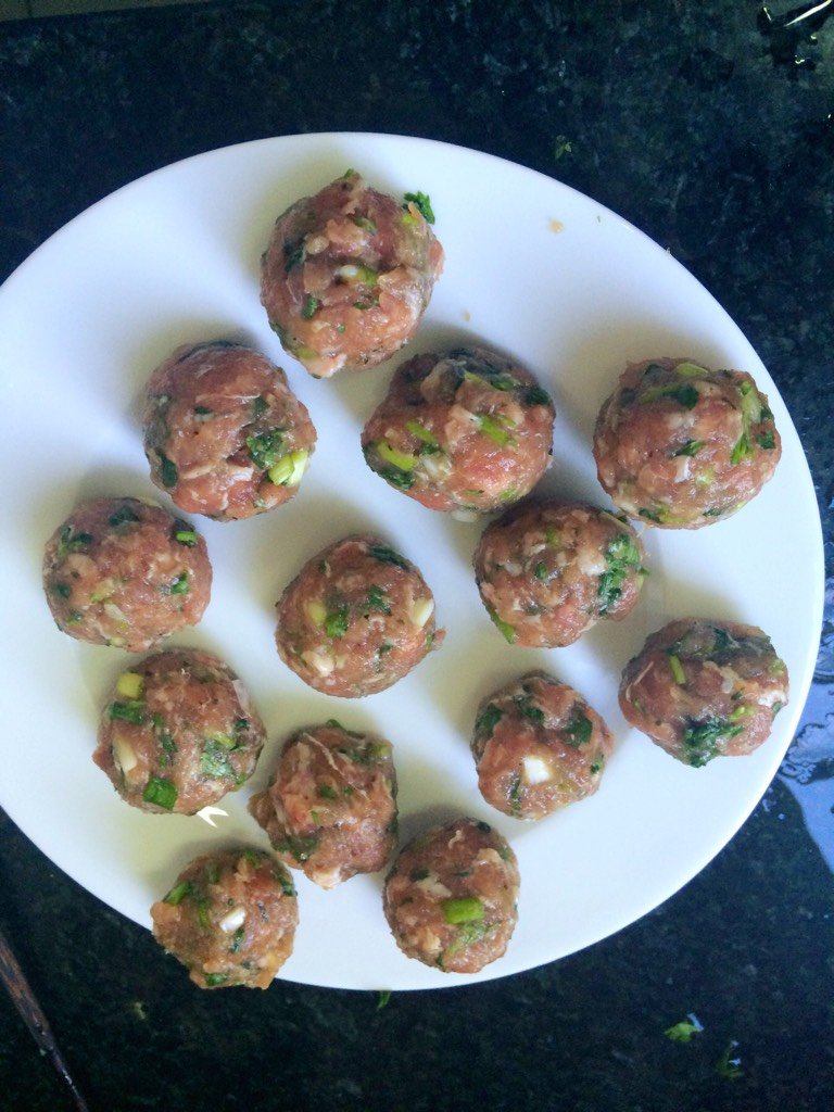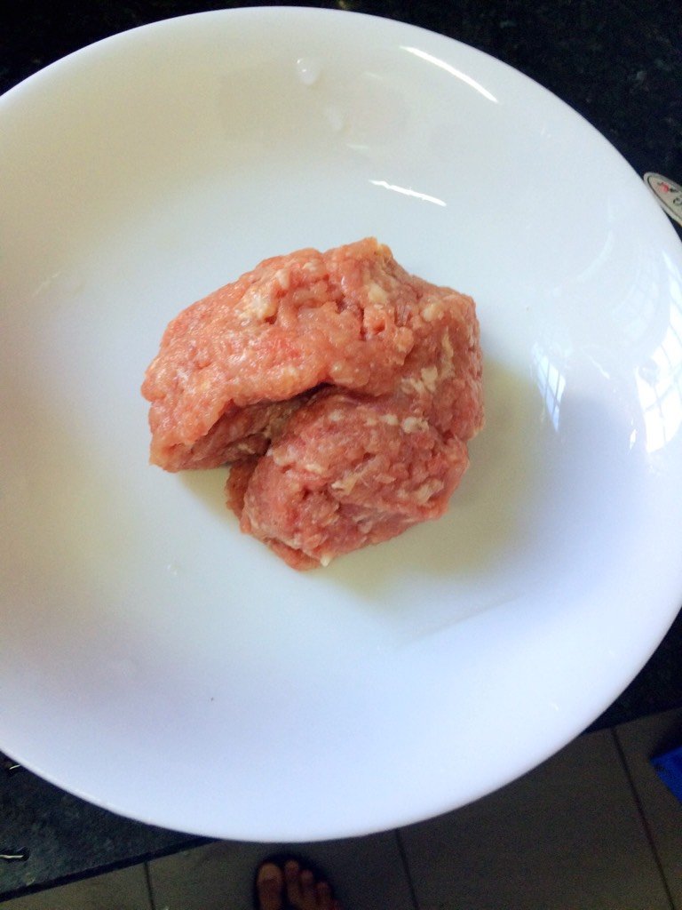 把肉泥捏出丸子,最简单就一只手挤出从大拇指和食指里挤出,另外一只手接住。大小根据自己喜好!