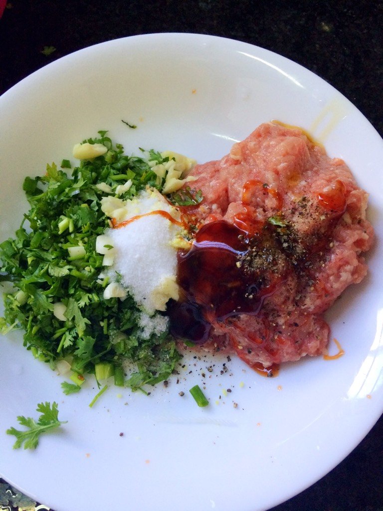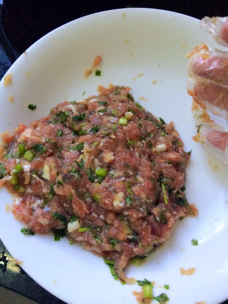 把猪肉,香菜,葱花,盐,鸡精,胡椒粉,老抽拌匀,带上一次行手套抓匀。