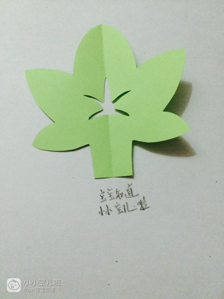 把剪好的纸打开,然后压平一下,一片绿概倘色的剪纸树叶就完成了。