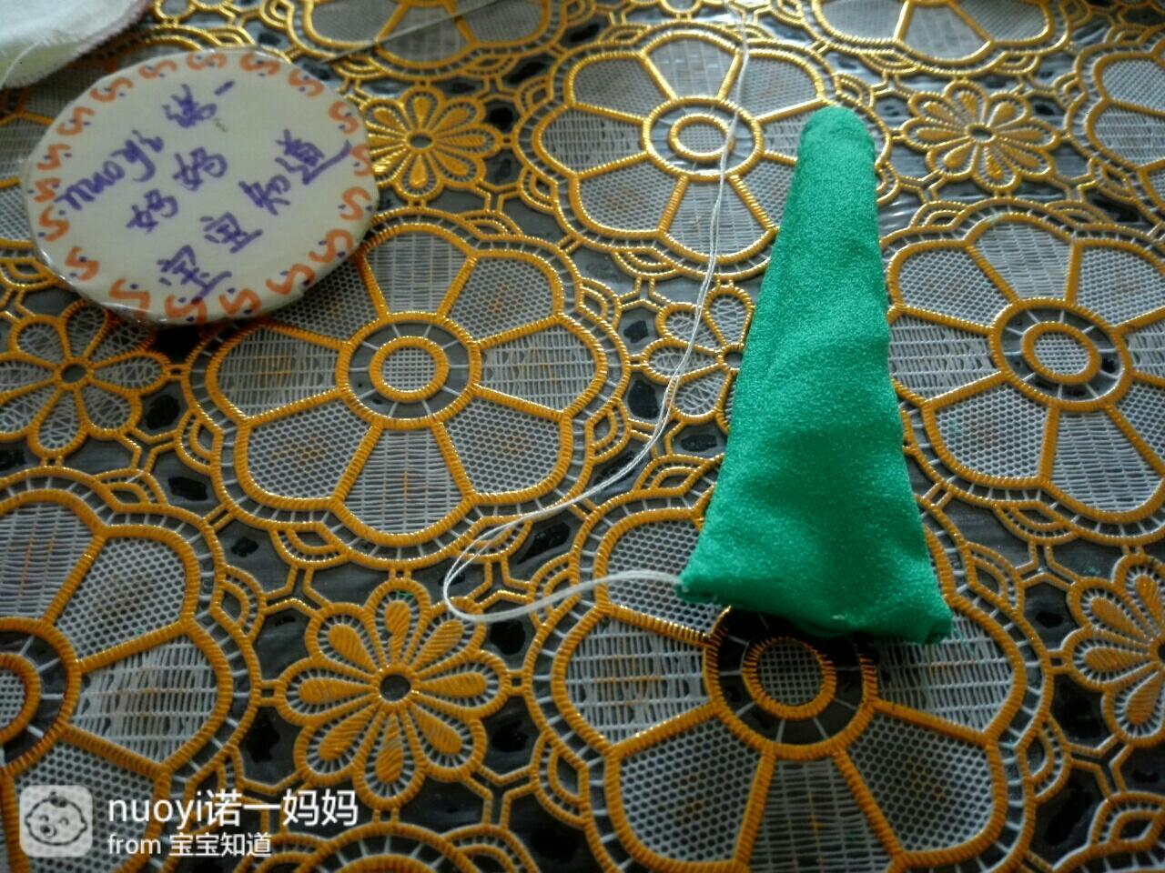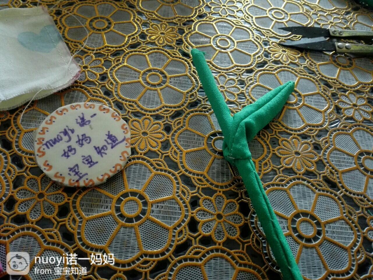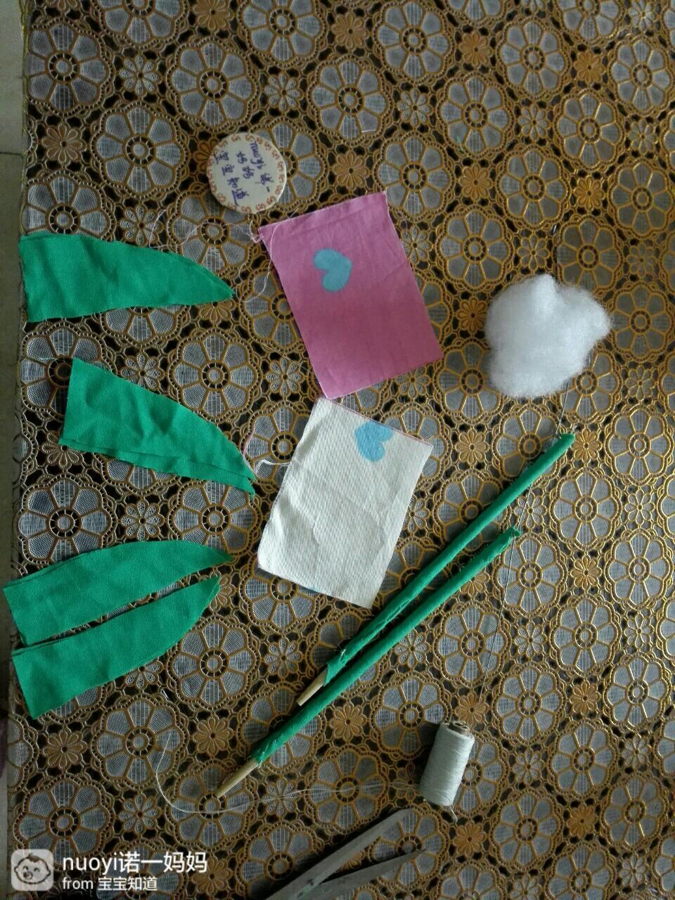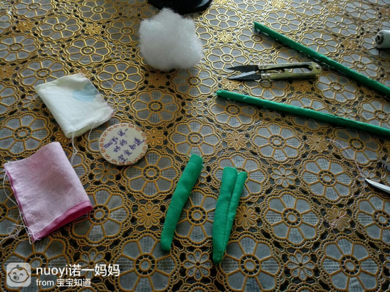 准备材料,因为我做的是两只同步的,所以多剪了几片叶子,两块长方形布片,筷子用绿色的布包上缝合好成了枝干,两只,需要填充棉和针线就可以了