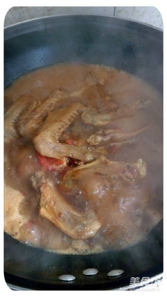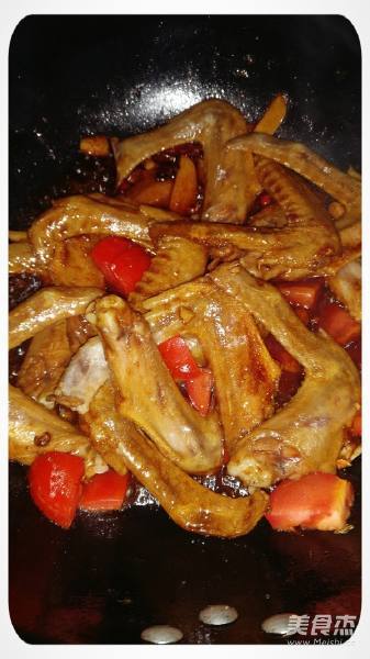 2. 锅内烧热,放入色拉油(倒多点哦油温到达200度左右)放入鸭翅(这期间不要放入任何东西)鸭翅煎至表皮金黄色,就可以一次放入(盐 白砂糖 料酒 生抽(可以少许放点老抽提色)再放入点切碎的西红柿块)炒出香味后,可以加入水(水位看您的鸭翅多少而定哦 鸭翅多 水多放 鸭翅少 水少放 烧制水分吸干)