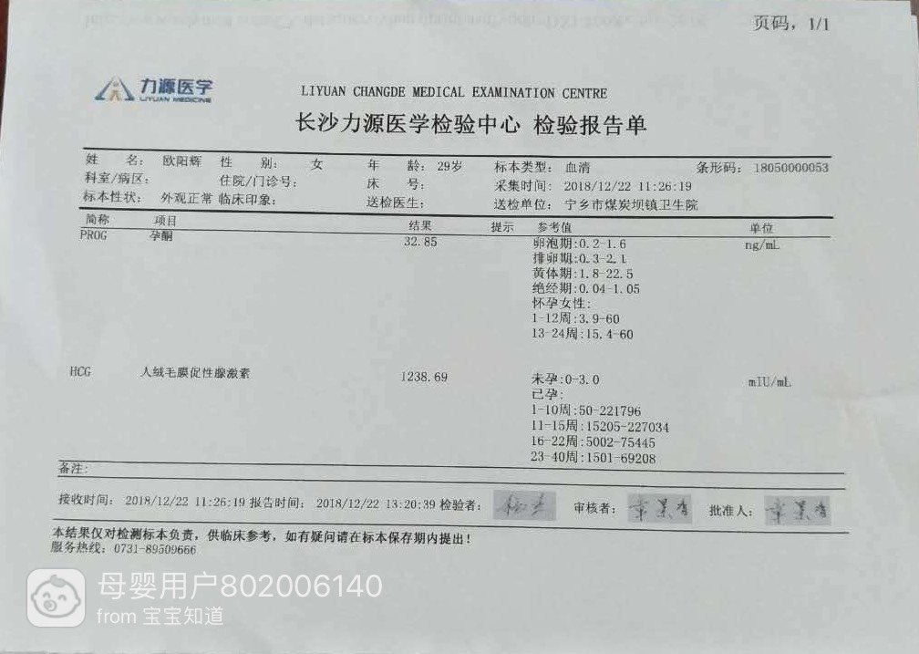 2018年12月22日(四周零六天)孕酮32.85 HCG值1238.69