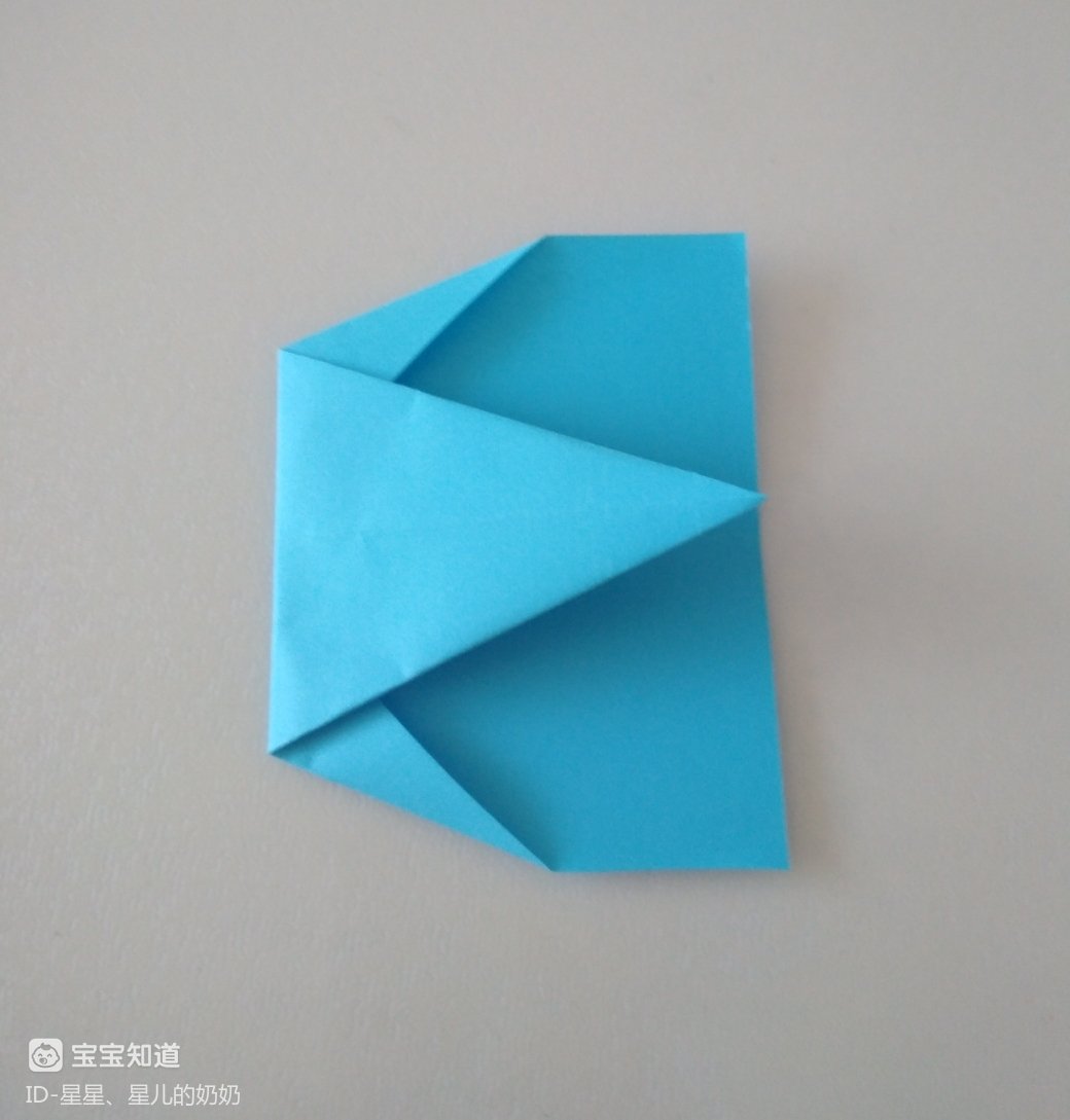 左角相邻的两条边向中间悠貌折叠,两边顺势按压出三角形。如下图所示;