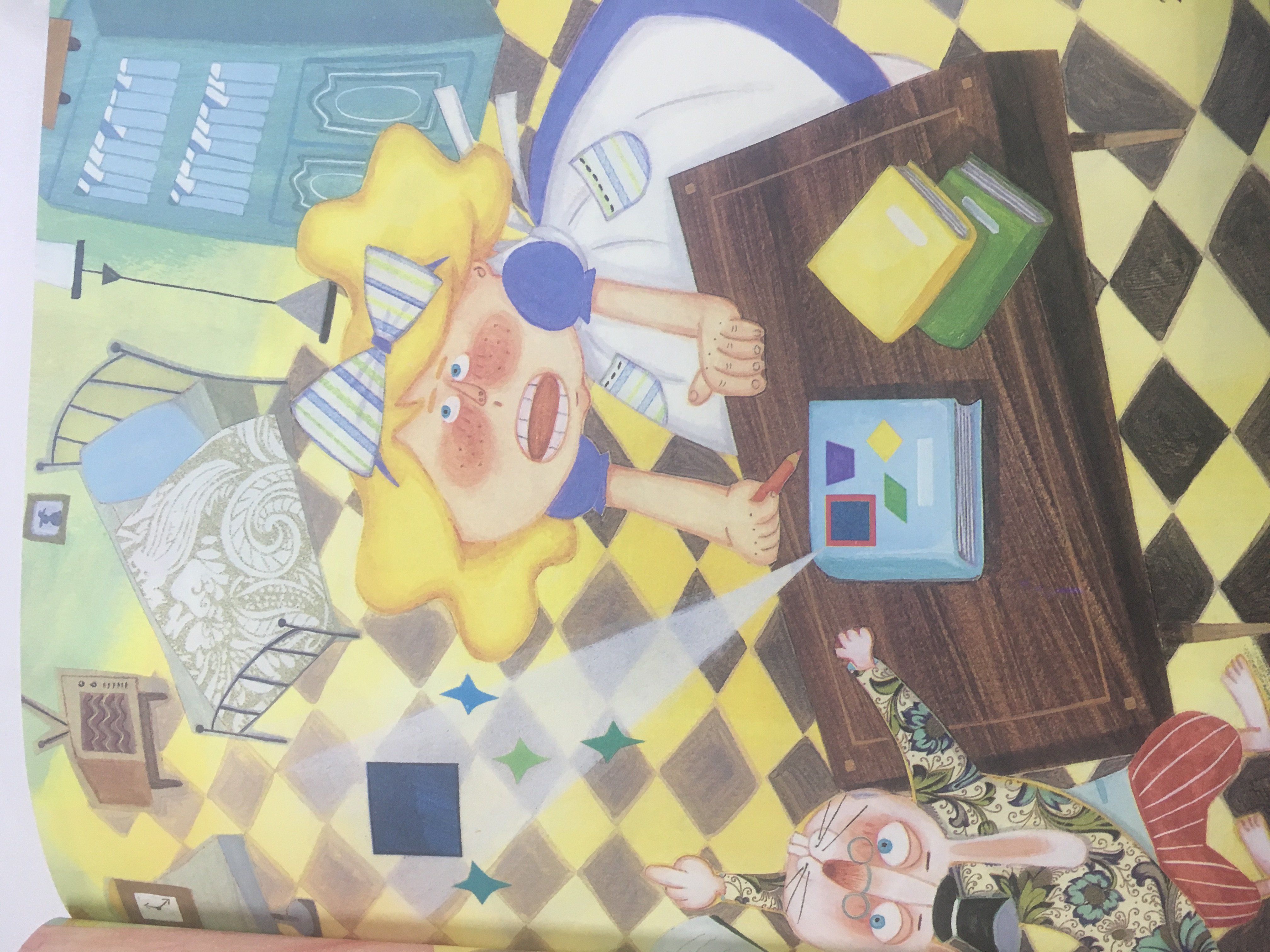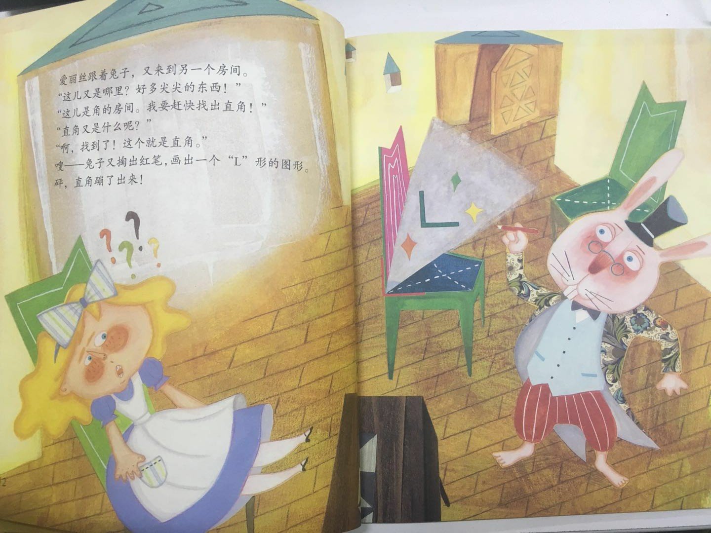 接着,兔子带她来到了第二个房间:角的房间。这次兔子要从里面找出直角带走,他又掏出红笔,画了一个像“L”的图形。砰的一声,直角就蹦出来了。