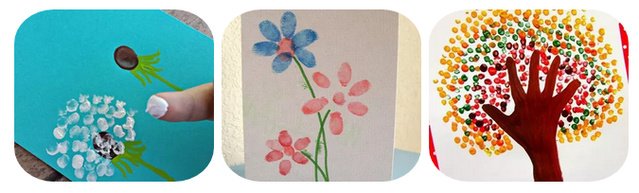 孩子用手指画出的蒲公英、花朵和大树