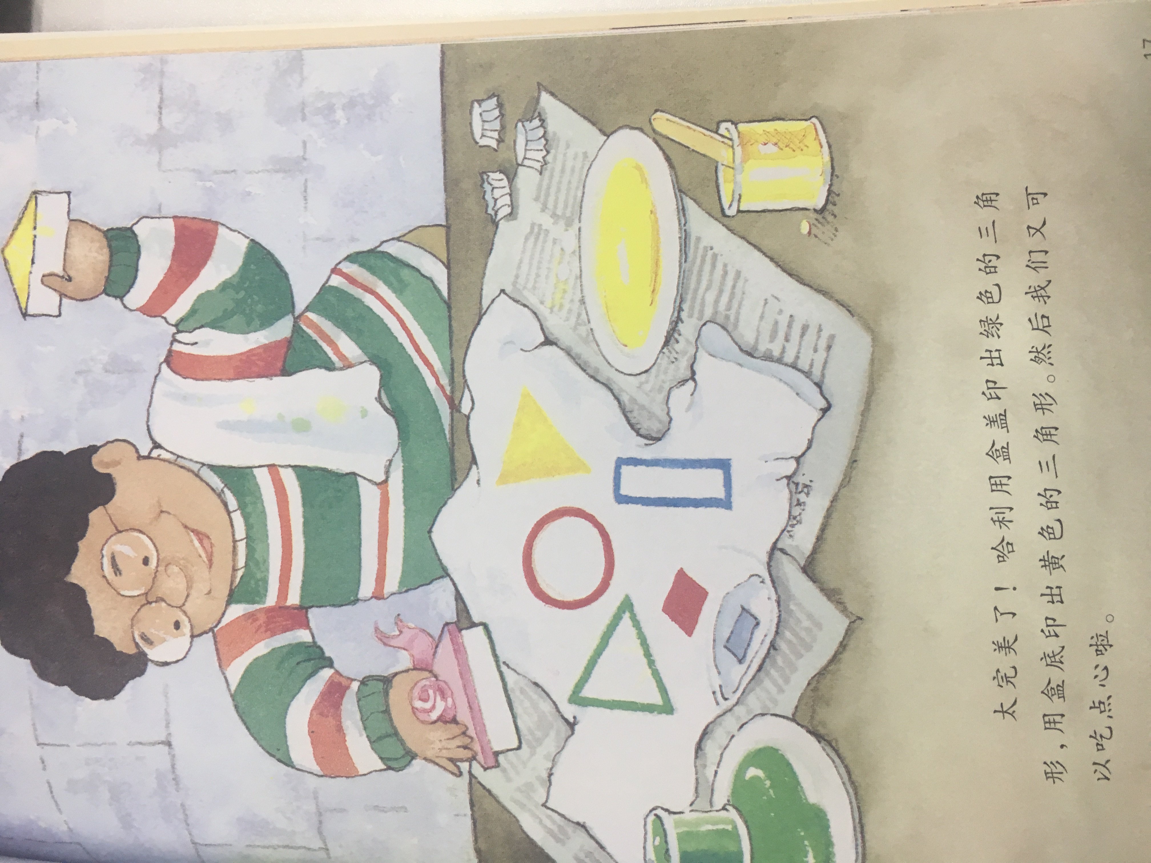 圆最好认了,他身上没有角,也没有直线,圆滚滚的就像是天上的太阳,或者一枚银币。(这里暂时不用教孩子区分正圆、椭圆和半圆等)