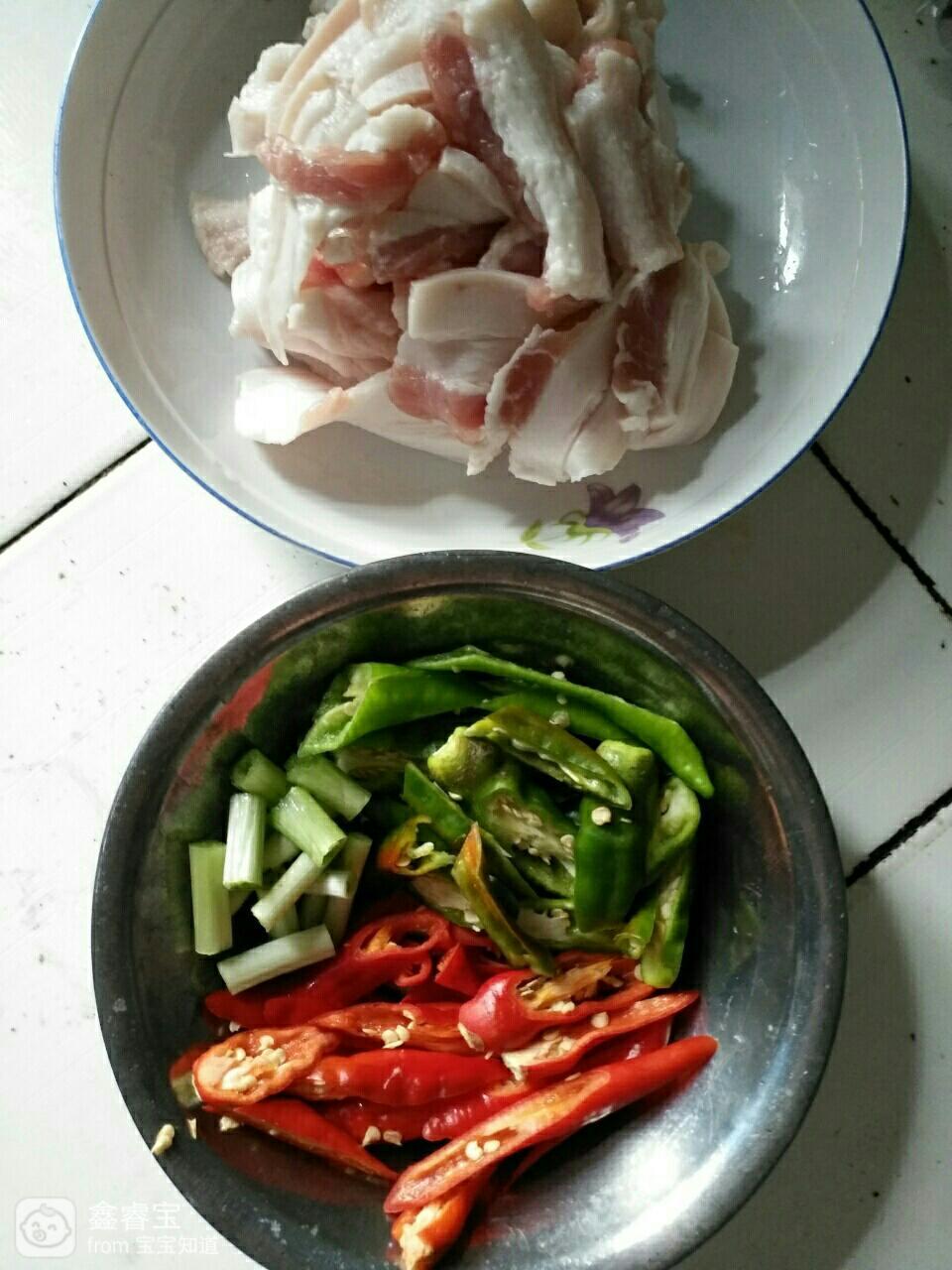 将五花肉切片,青辣椒、红辣椒斜切,葱头切短条。