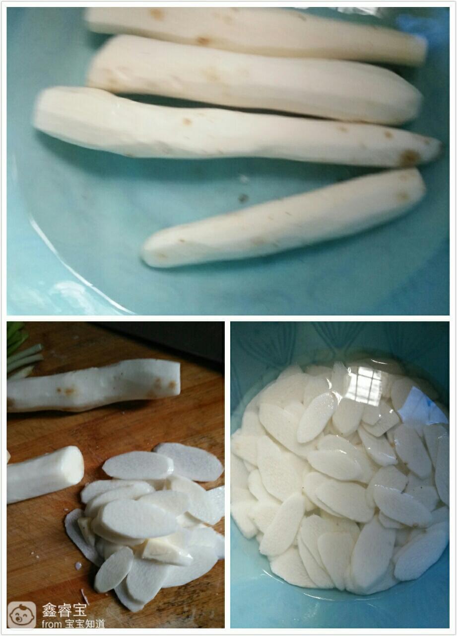 山药去皮,放水里加盐泡10分钟,然后再把山药切片,切好另放清水盆里。