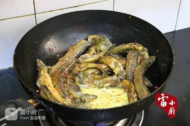 4、热锅凉油,放食用盐拌匀,再下泥鳅翻炒几个来回,再煎至一面上色之后再翻面煎至焦黄。