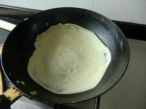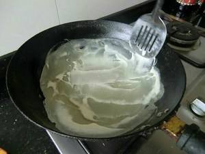 小火,用锅铲将适量面倒入锅中,沿锅四周开始转圈,最后成为一个圆形