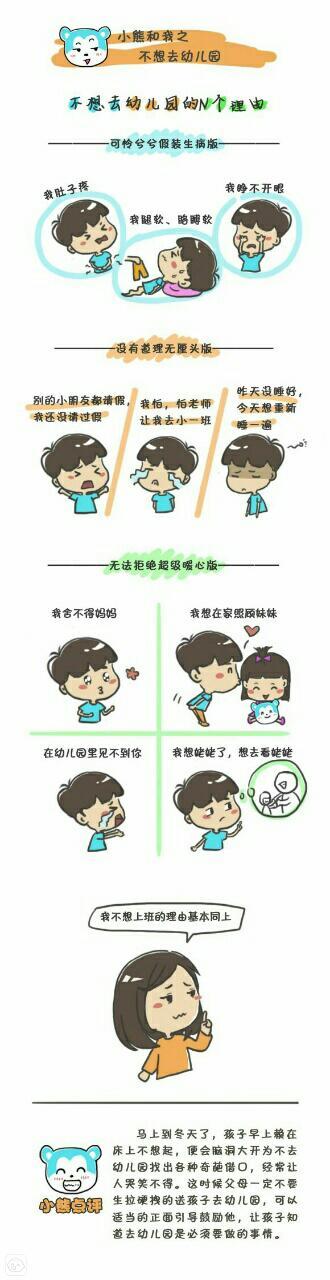 天气越来越冷,孩子早上赖在床上不想起,便会脑洞大开为不去幼儿园找出各种奇葩借口,经常让人哭笑不得。这时候父母一定不要生拉硬拽的送孩子去幼儿园,可以适当的正面引导鼓励他,让孩子知道去幼儿园是必须要做的事情。