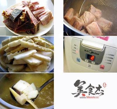 4. 约50分钟后,撇去汤上浮沫,加入笋片和袋装笋