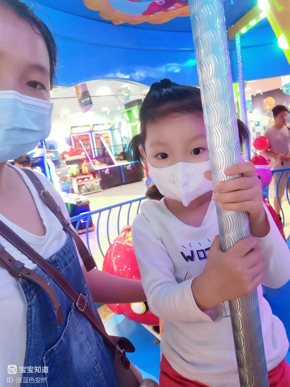 到了旋转们吊木马前,担心孩子不舒服,我又询问了一次,结果她还是回答要做。因此,我们就一起上了旋转木马的圆盘。孩子上去后选了一个自己喜欢的造型座位坐下,我站在旁边守护着她。