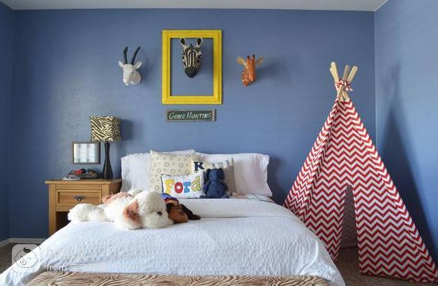 可以在孩子房间墙面上贴上喜欢的动画片人物、床上放一些孩子喜欢的玩具,玩会累了比较容易入睡,也不会觉得孤单。