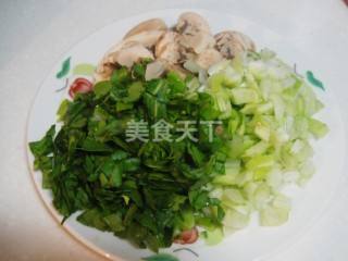 2 上海青切丁、蘑菇切片备用。