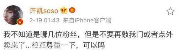 无独有偶,因《延禧攻略》走红的许凯也在微博称,半夜经常有人敲自己房门,或者点外卖