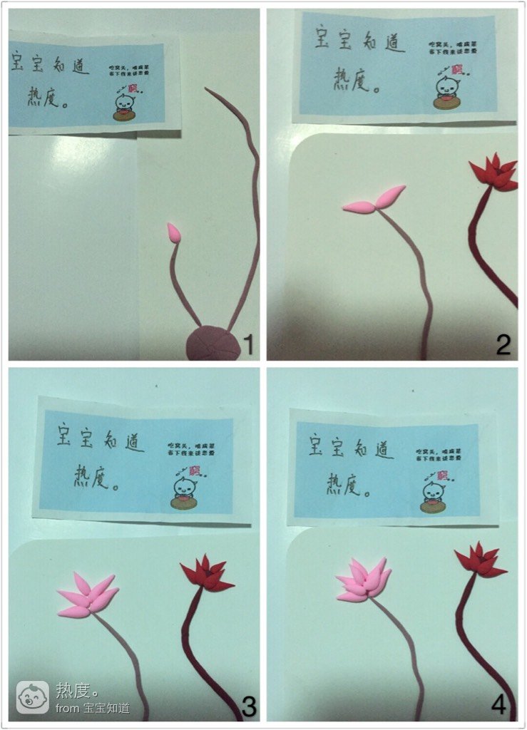 接着取红色粘土再捏一些水滴形状,组合粘好,形成一朵盛开的荷花。