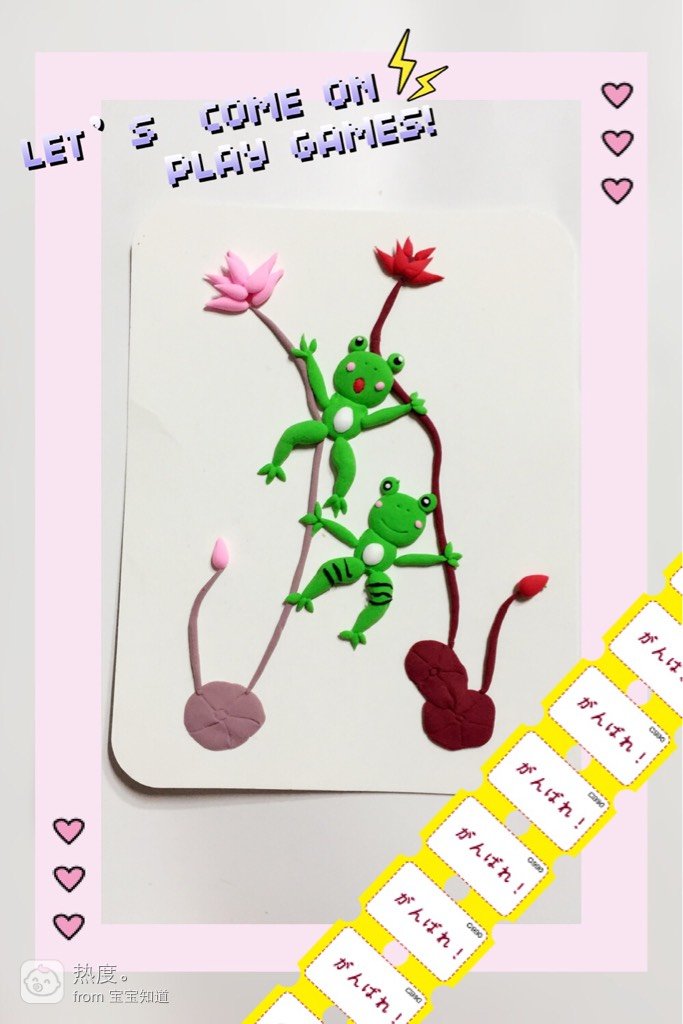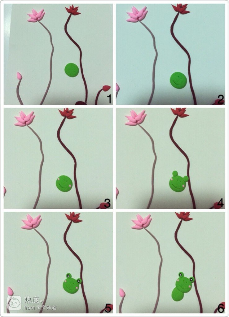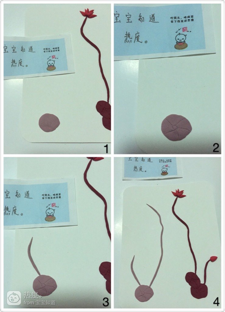 再用这种颜色的粘土搓一长一短两条长条,粘在荷叶上方位置。