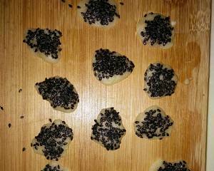将面团取出,用手揪成若干小块后压扁,(大小随意,但尽量均匀),将压扁的面片在芝麻堆上沾一下,在用手将芝麻略按一下,以让芝麻固定的更牢固。之呈最此时预热烤箱190度,上下火