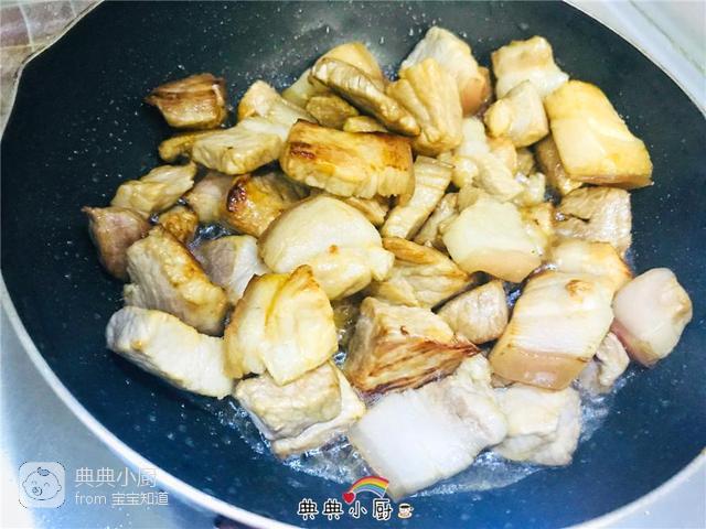 4,糖炒好之后,倒入焯好水的五花肉。慢慢翻炒至肉上色,就是两面都差不多金黄色。这里记住是小火哦,毕竟有糖了,如果再大火那就悲催了。
