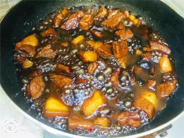 6,大火烧开之后,可以加一点儿生抽,蚝油。这个看自己的喜欢啦,主要是上色作用。转小火之后,一般我会选择换砂锅慢炖的,但是这次我偷懒了直接在炒锅里焖了半个多小时,再次打开锅盖后,用筷子戳一下,如果一戳就化那就可以收汁了。