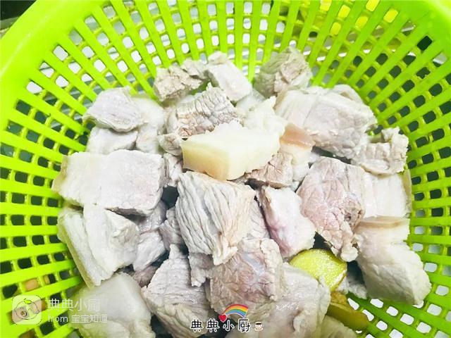 2,烧开之后,在锅里翻几个,关火,立马用凉水激一下,这样红烧出来之后口感非常好,不会柴。生姜片就挑出来不要了。个人觉得焯水的时候放就好,成品红烧肉不需要放这些的。