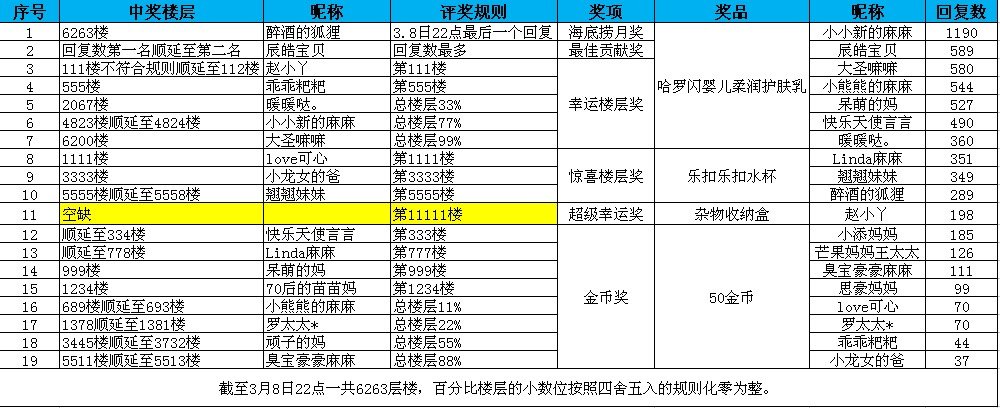 各位亲们,非常感谢小伙伴们积极参加咱们西安圈的活动。又到了我们公布获奖名单絮做的时间了,抢楼活动就是好了,不用纠结评奖。这次我们11111楼没有达到,只能很遗憾的取消了。很可惜,下次再接再厉哦!希望各位瘦成一道闪电的愿望都呢个实现哦!言归正传,我们现在来公布本次活动的获奖名单啦: