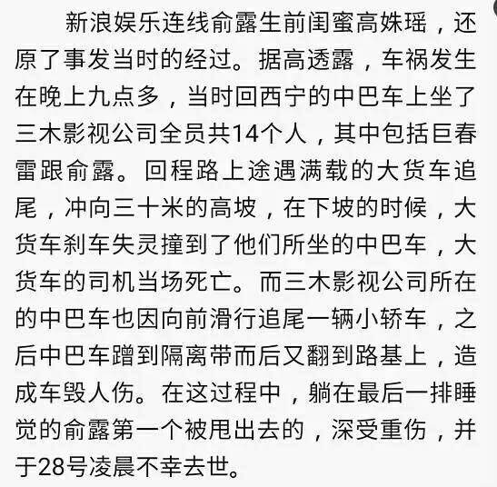 孕40周+0天 LV.24据俞露生前的好朋友高姝瑶透露,事故原因是被大货车追尾,大货车刹车失灵撞上了俞露他们所乘坐的中巴。大货车司机当场死亡,除俞露外的其他两位死者分别是巨春雷在当地的好朋友,还有一位三木影视公司的工作人员。