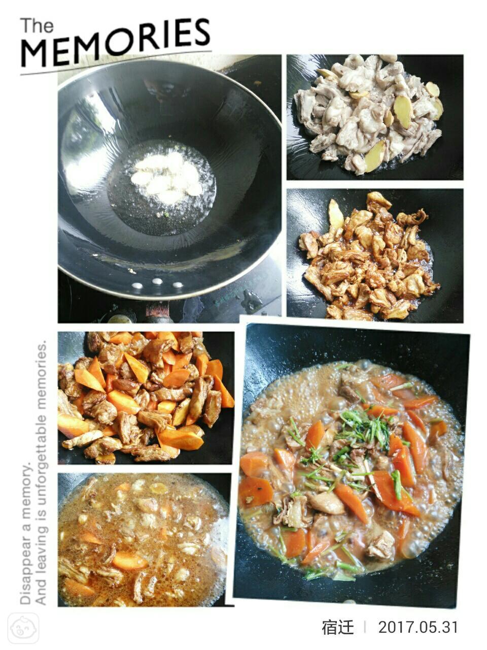 油锅烧热,放入姜片爆香放入羊腩煸炒,加入酱油提色,炒至羊肉表皮微焦放入胡萝卜块煸炒