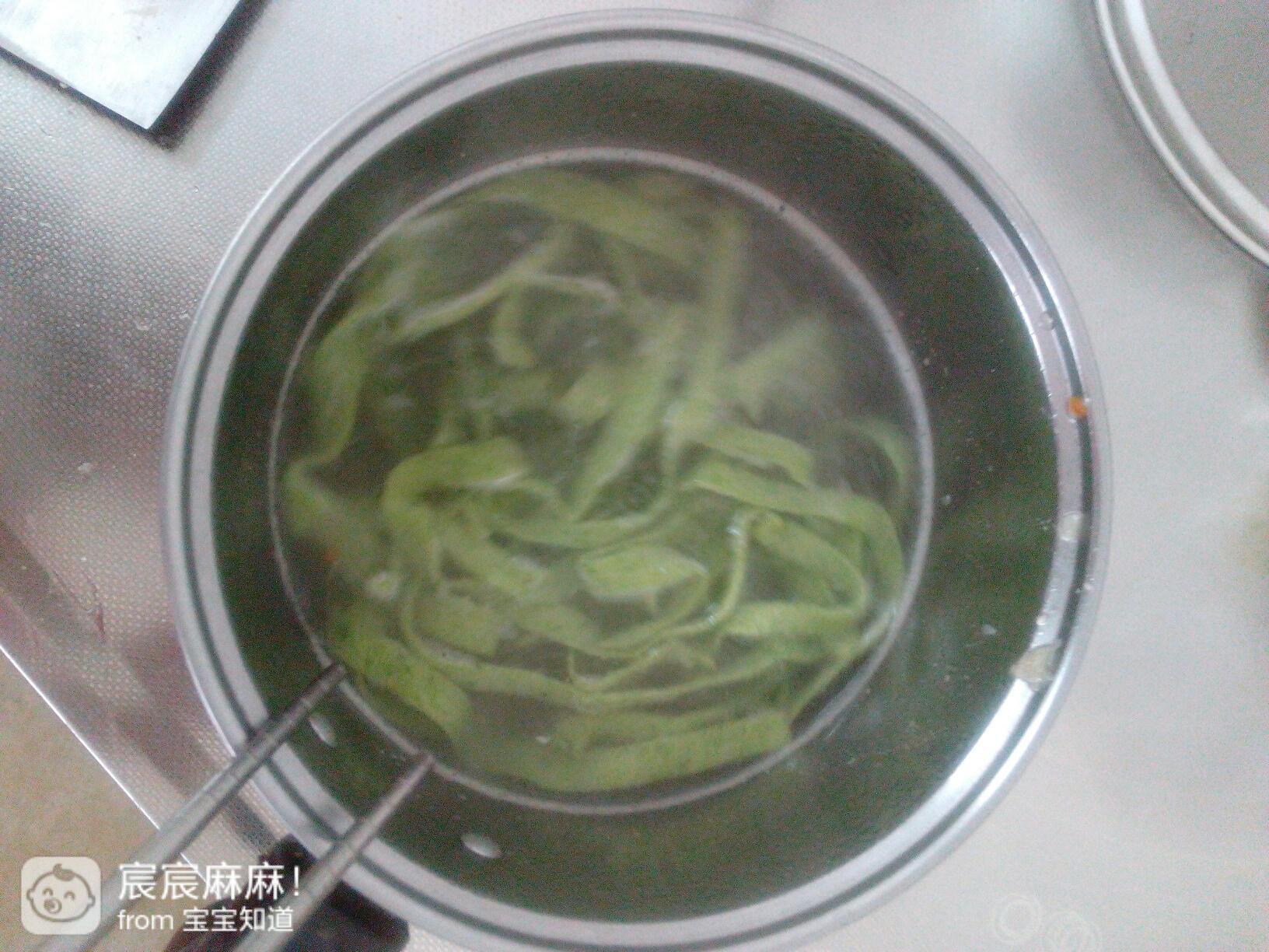 第六步:锅里烧水下面!给宝宝煮五分钟就熟了!最后倒入刚才炒好的菜!