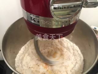2 先1档搅拌无干粉后转2档揉成光滑能拉出有弹性的薄膜后放入黄油,揉至薄而不易破的手套膜