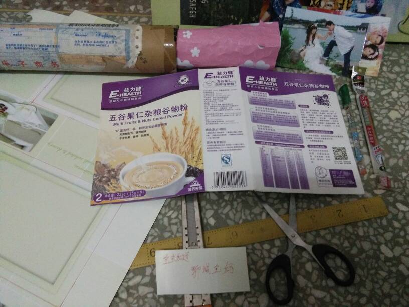 准备材料: 米粉盒(其他盒子也可以,主要起固定作用) 硬纸(我还是采用的窗帘样板纸) 贴纸(以前网上淘的余下品) 照片 彩纸(这个忘记上图) 尺子 刀子 剪刀 彩色笔 橡皮 铅笔