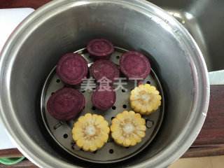8 打南瓜糊时就先把鸡菜了蛋和玉米番薯放下去蒸煮,粥熟这些也熟啦。