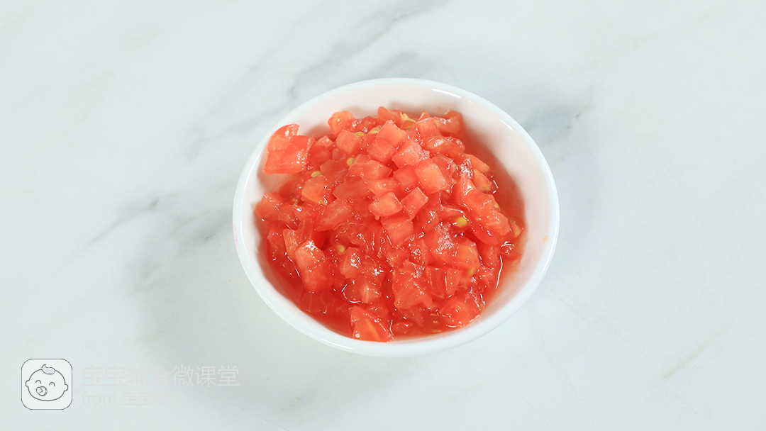 10、番茄划十字,放入开水中浸泡10分钟后去皮,切小丁取重80克。