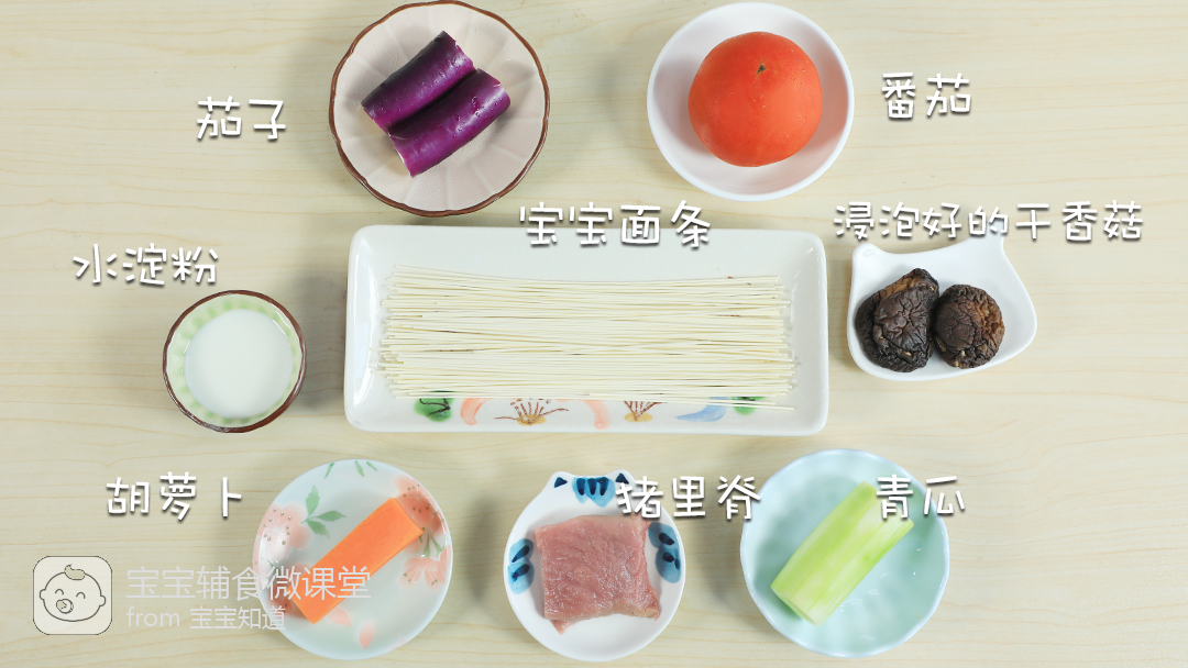 1、准备食材:番茄1个,茄子20克,青瓜40克,猪里脊20克,胡萝卜20克,宝宝面条20克,浸泡好的干香菇10克,水淀粉8克(清水5克,玉米淀粉3克)。