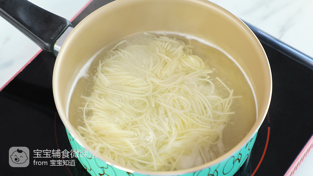 2、奶锅水开后倒入宝宝面条,煮5分厘寸铜钟。